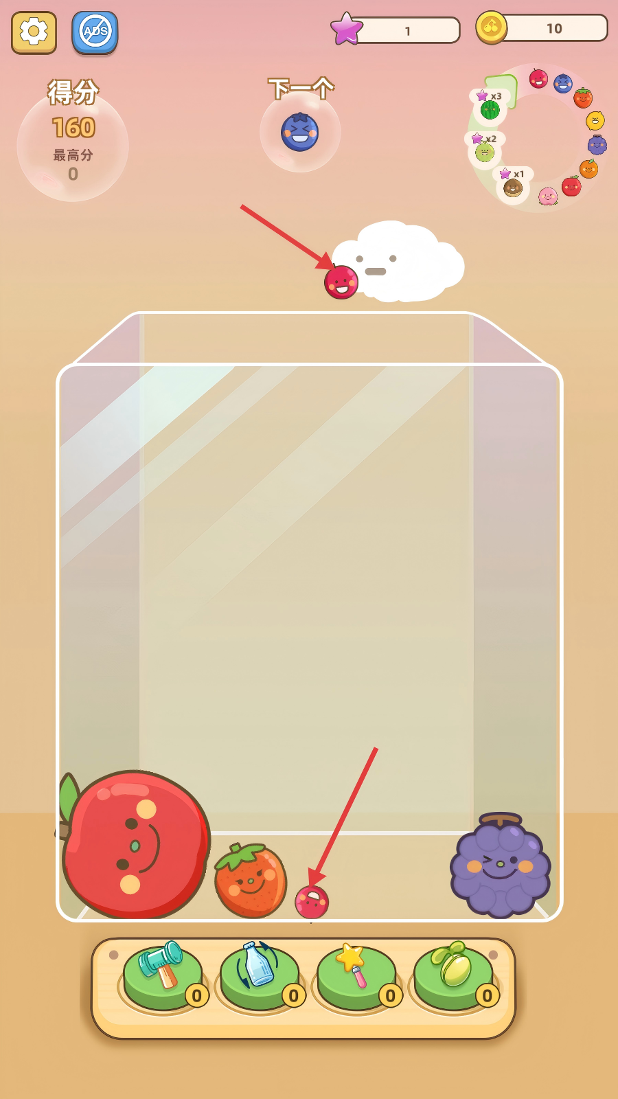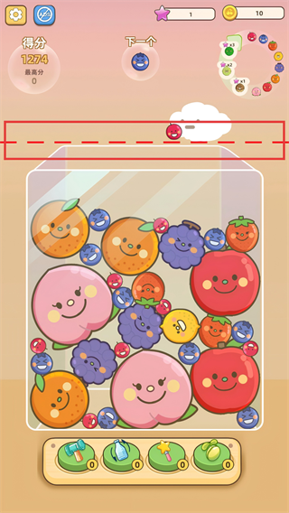 3、角落利用技巧:将暂时无法合成的水果放置在屏幕角落位置,为后续水果合成留出充足空间,避免过早堆满游戏区域。