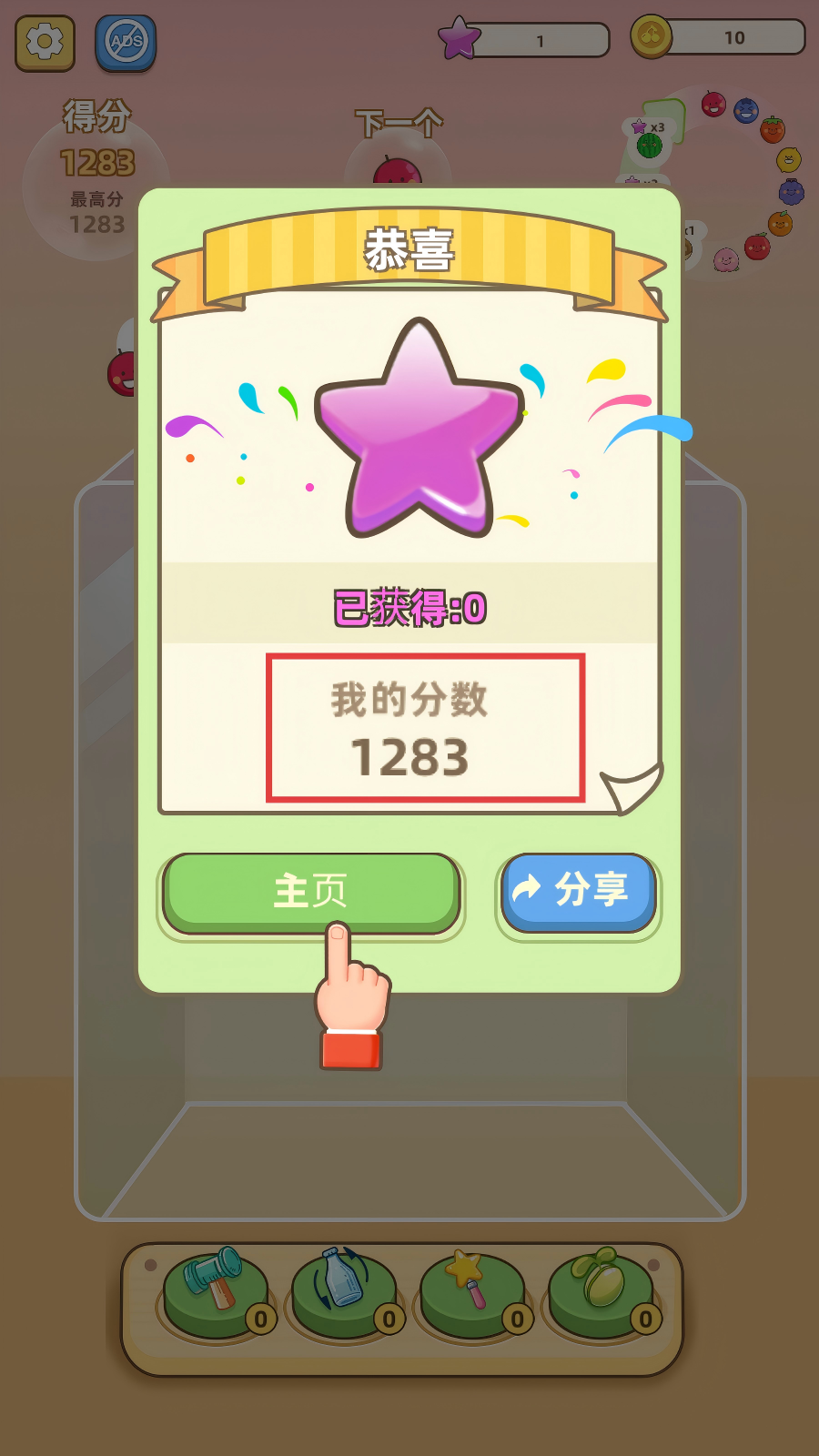 4、游戏结束后,可查看得分,点击【主页】返回主界面。