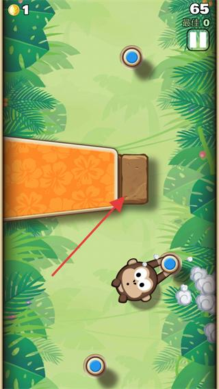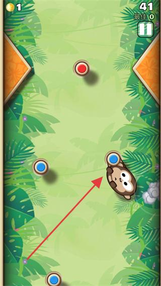 1、进入游戏,操控小猴子移动,让小猴子触碰蓝色圆点,借助圆点反弹向上移动,避开红色圆点。