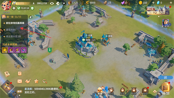 4、查看左侧任务提示,如前往旅馆招募英雄,按指引前往对应建筑,完成任务获取资源和英雄。