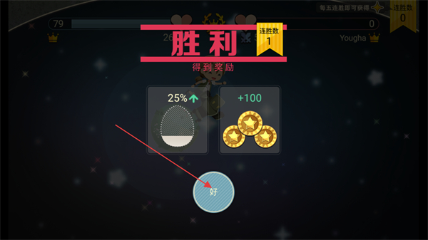 4、成功击败敌方角色,出现胜利提示后,点击好按钮,领取+100金币等奖励。