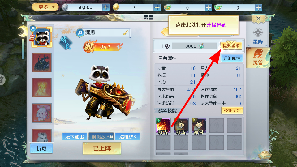 4、进入灵宠界面,查看灵宠属性,点击提升升级,消耗资源,提升灵宠等级,增强战力助力战斗。