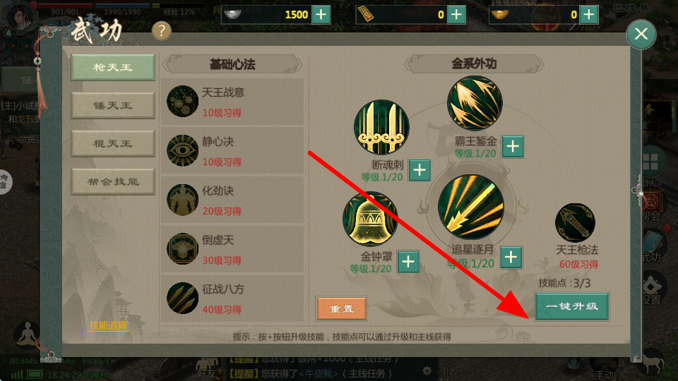 3、进入功法界面,在不同功法,如枪天王等流派的功法间进行切换,还能对功法进行一键升级。