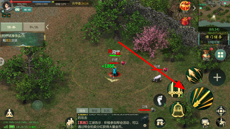 4、野外遇到狼等怪物时,点击右侧攻击技能,释放技能对狼发起攻击,将其击杀,获取战斗收益。