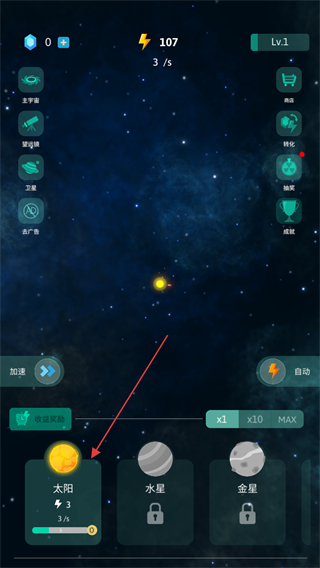 4、进入新界面后,点击太阳图标,消耗电量开始创建星球,逐步解锁其他星球如水星、金星。