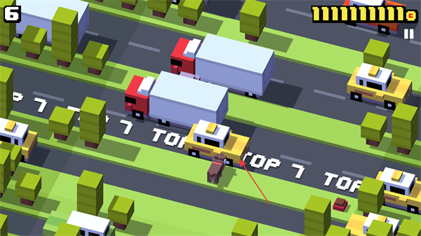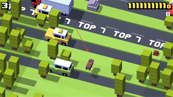2、成功穿过马路后,继续操控角色前进,留意道路上出现的TOP7等标识,同时注意来往车辆。