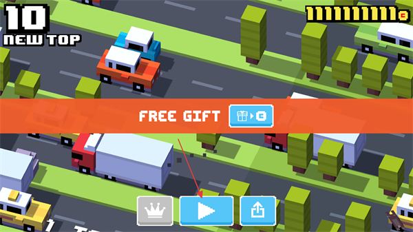 4、达到一定分数如10分,出现FREEGIFT提示时,点击下方播放按钮图标,可选择获取奖励或继续游戏。