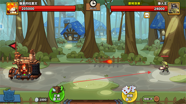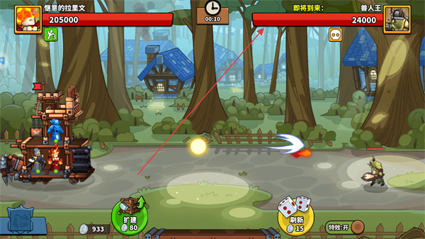 3、密切关注敌方,如兽人等怪物的进攻动向,利用我方防御塔和精灵角色自动攻击敌人,削减敌方血量。