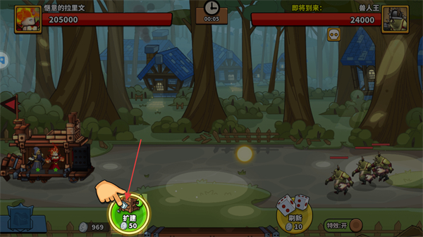 1、进入游戏,观察界面上方显示的我方与敌方血量条,如愤怒的拉里文205000血量,兽人王24000血量,留意剩余时间。
