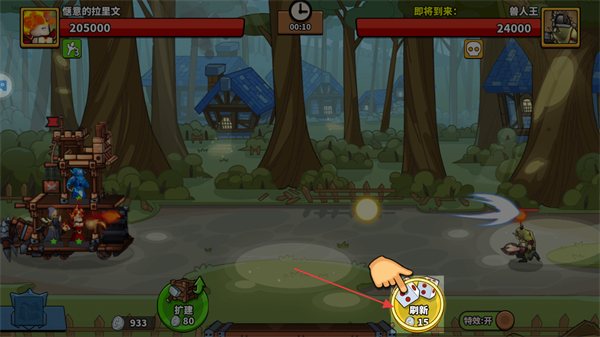 4、点击刷新按钮,消耗资源,如10、15,来更换或获取新的精灵卡牌,合理调整防御策略,争取赢得战斗胜利。
