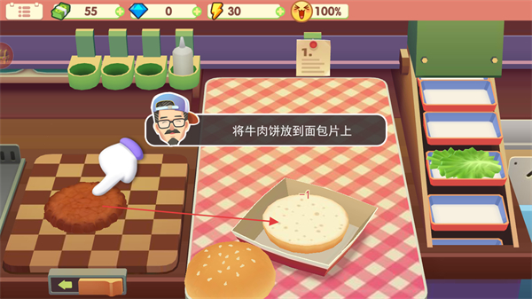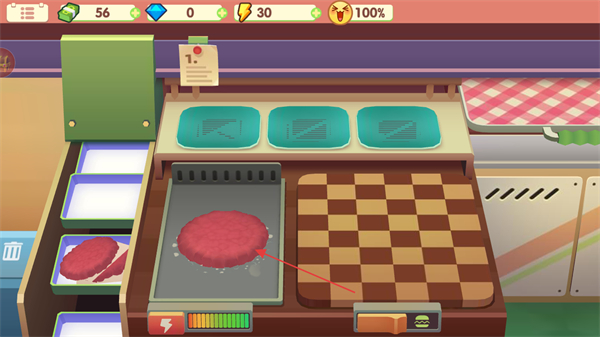 1、查看界面上方资源数值,点击食材栏取牛肉饼,放烤架上烹饪。