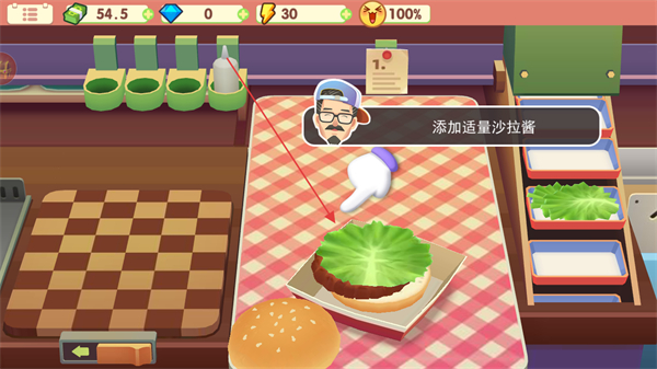 3、从食材栏选取生菜放在牛肉饼上,再添加适量沙拉酱。