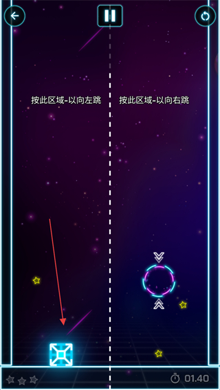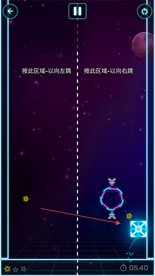 2、利用右侧跳跃区域,控制方块向右跳跃,躲避障碍并收集星星。