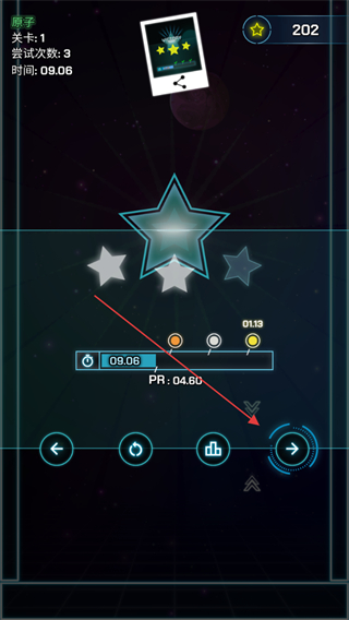 4、完成关卡后,查看关卡,尝试次数,时间等信息,点击箭头进入下一关。