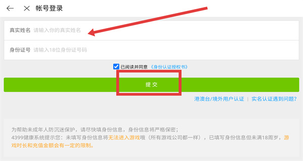 4、在进入到实名认证页面中,点击上方输入框依次填写姓名和身份证号后,点击提交按钮即可完成注册操作。