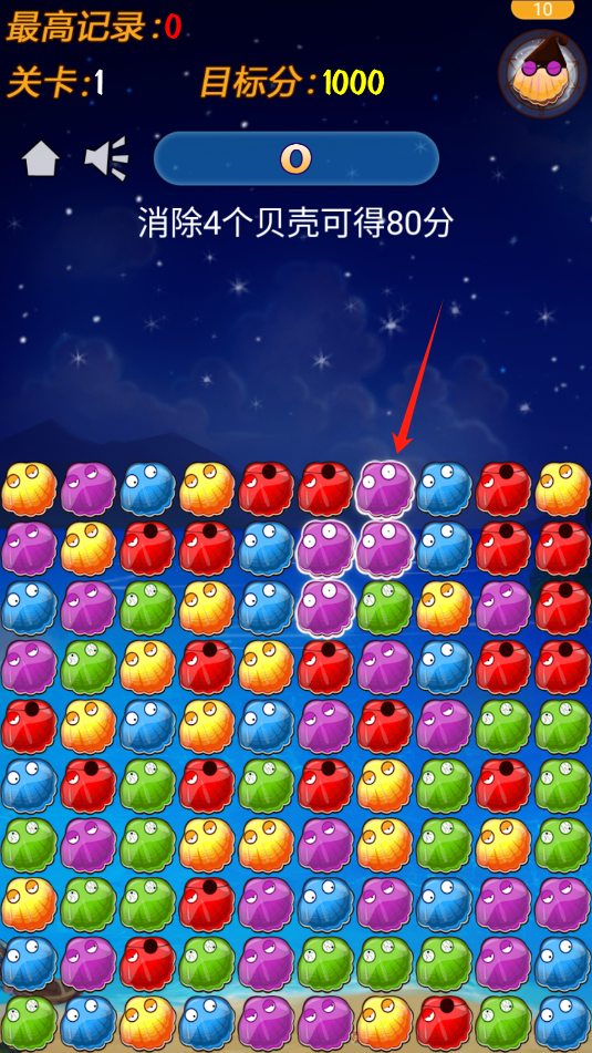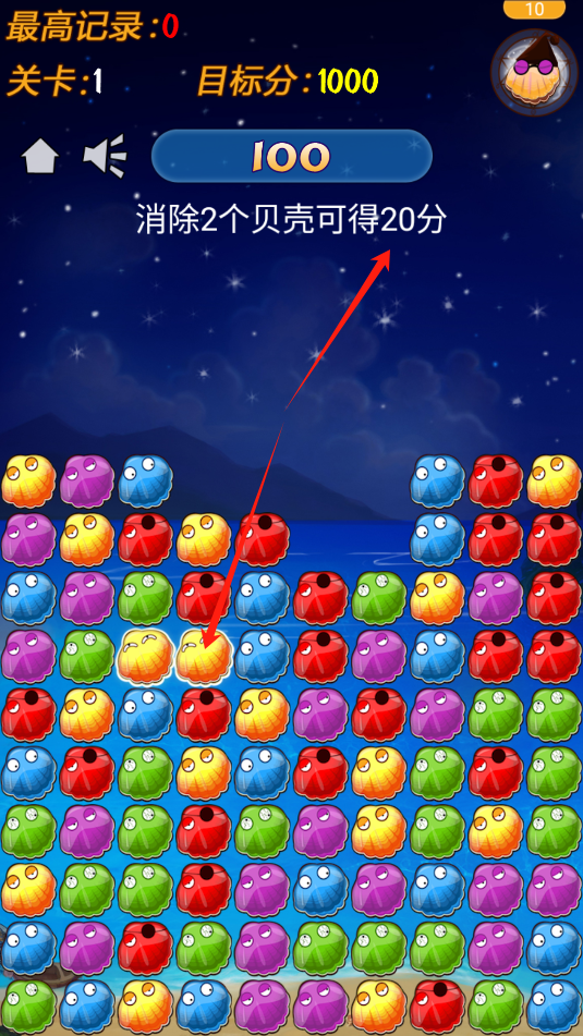 3、消除的贝壳数量越多,分数就越高,达到目标分数1000分时,即可通关。