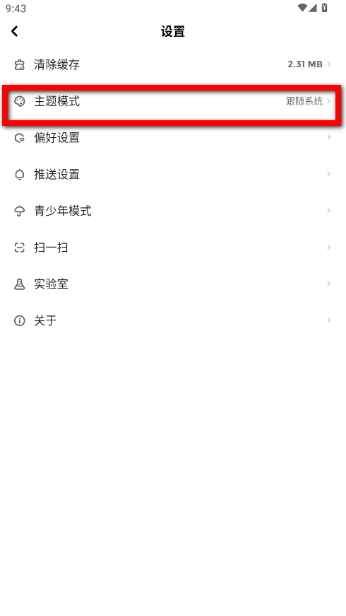 3、在设置界面里,找到并点击主题模式选项。