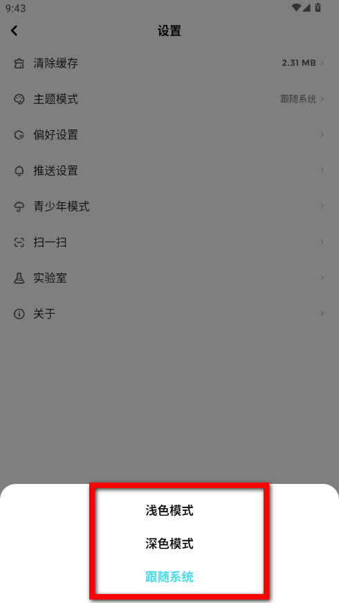 4、在弹出的主题模式选择框中,选择浅色模式、深色模式或跟随系统即可完成设置。