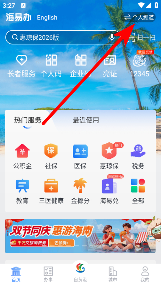 1、在海易办的首页,点击右上角个人频道切换为法人频道。