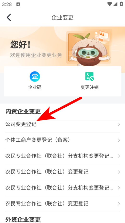 3、在企业变更的页面,需要选择变更类型如公司变更登记。