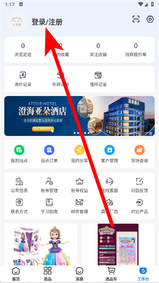 2、进入工作台页面后,找到上方显眼的登录注册按钮,点击该按钮进入登录相关界面。
