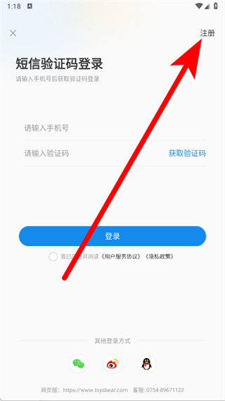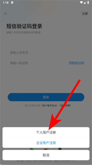 3、在短信验证码登录页面,点击右上角的注册选项,此时会弹出注册类型选择框。