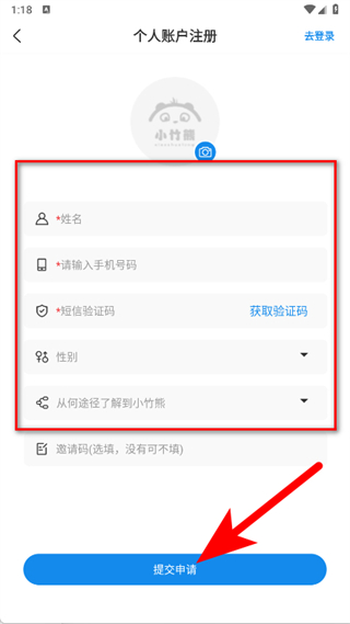 5、依次填写姓名、手机号码,点击获取验证码并输入收到的验证码等信息,点击提交申请按钮,完成注册流程。