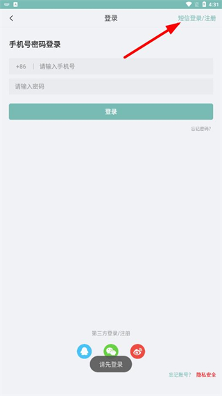 3、在登录页面,点击右上角短信登录/注册,进入短信登录弹窗。