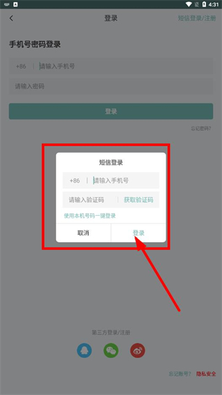 4、在短信登录弹窗中,输入手机号、验证码,点击登录,完成登录操作。