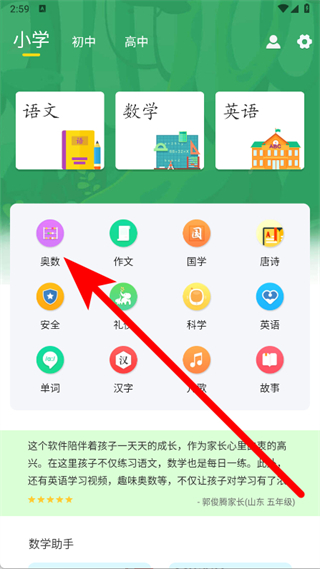 1、打开乐学课堂,在主界面中找到奥数图标并点击,进入奥数学习页面。