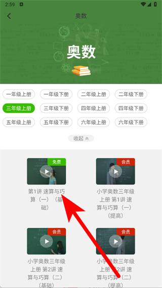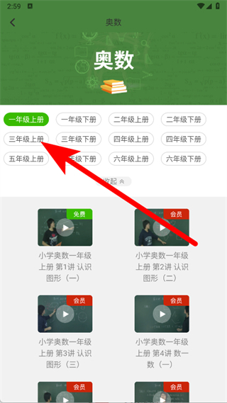 2、在奥数页面,点击三年级上册选项,切换到对应年级的奥数内容。