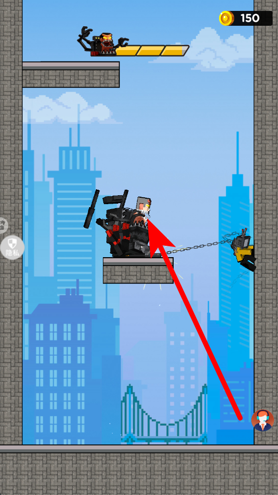 3、操控角色,利用场景平台、武器技能,躲避机器首领攻击,寻找输出时机,击败首领后获取奖励,用于解锁更多皮肤提升战力,循环挑战。