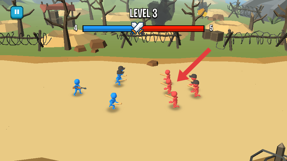 1、进入LEVEL2,蓝色小人部队与红色敌人交锋,优先集火箭头指向的敌方单位,快速削减其战力,为胜利奠基。
