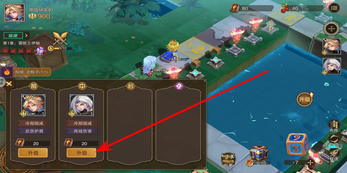 3、佣兵属性升级打开佣兵面板,选择前中后排佣兵,点击升级按钮消耗资源,强化冷却缩减、反伤护盾等属性,逐步提升团队战斗能力。
