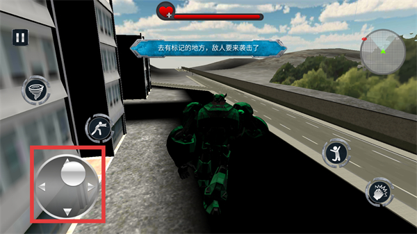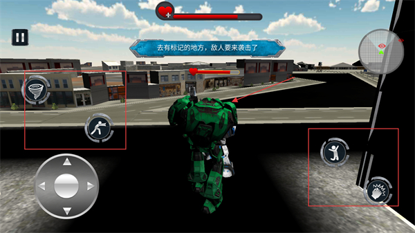 2、用左侧摇杆操控机器人移动,根据提示前往有标记的敌方袭击区域。
