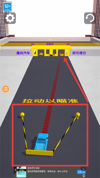 2、拉动黄色装置瞄准,将卡车撞向目标汽车,进入奖励区得分。