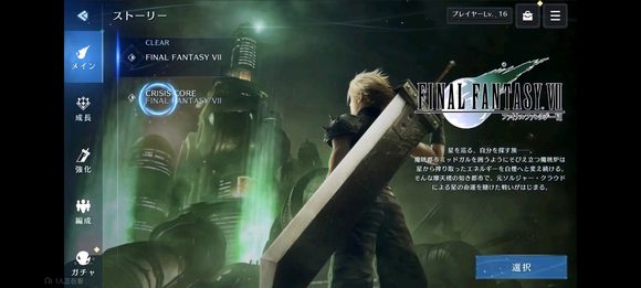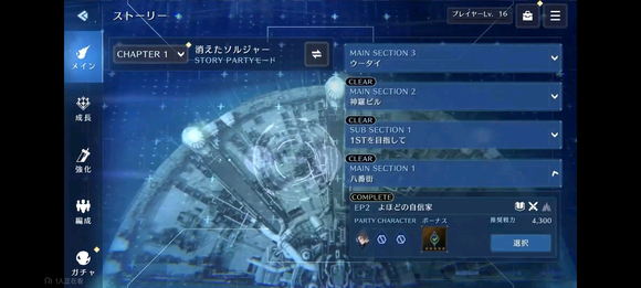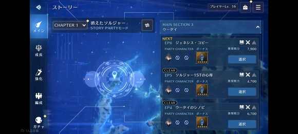 左边是主菜单,角色养成,装备强化,队伍编辑,抽卡。主菜单选择要游玩的章节,目前看到还只有本传和cc,右上角看到player lv16,应该是玩家等级和角色等级分开,还有商店和菜单的按键。