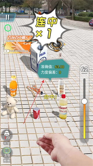 4、瞄准目标物品,调整力度和准确度,投圈命中可获得连中×1等奖励,积累金币。