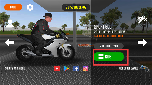1、选中【SPORT-600】摩托车后,点击【RIDE】按钮,即可进入赛道选择环节,开启赛车之旅。