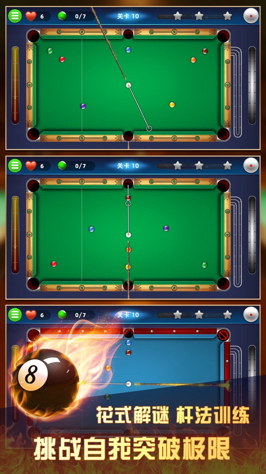 超凡台球游戏玩法一定要瞄准角度,然后快速出击,将球打入洞中!