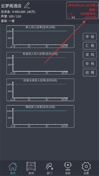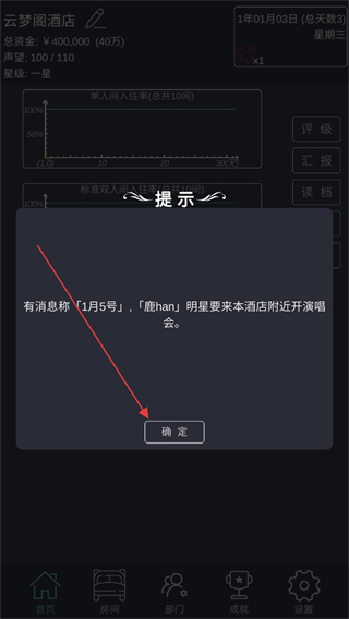 1、关注1年01月01日总天数:0等时间信息,查看酒店总资金、声望和星级,了解经营基础数据。