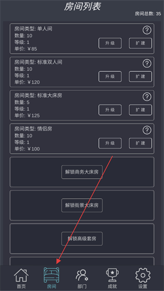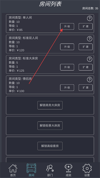 4、在房间列表中,点击升级按钮,提升单人间等房型的品质,以增加收入和声望。