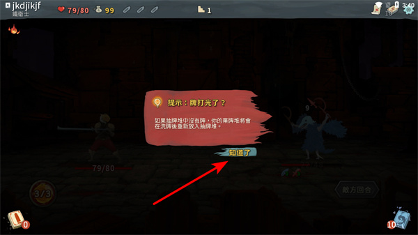 4、战斗中遇到提示牌打光了弹窗时,点击知道了按钮,这是关闭提示的基础操作,关闭后需了解弃牌堆洗入抽牌堆的规则。