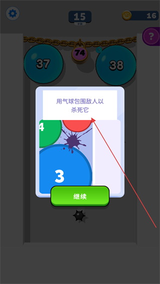 1、点击继续按钮开始游戏,释放气球使其上升,注意上方的关卡数如9、8、15关。