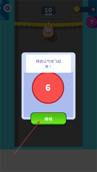 1、点击继续按钮进入游戏,释放气球使其飞起。