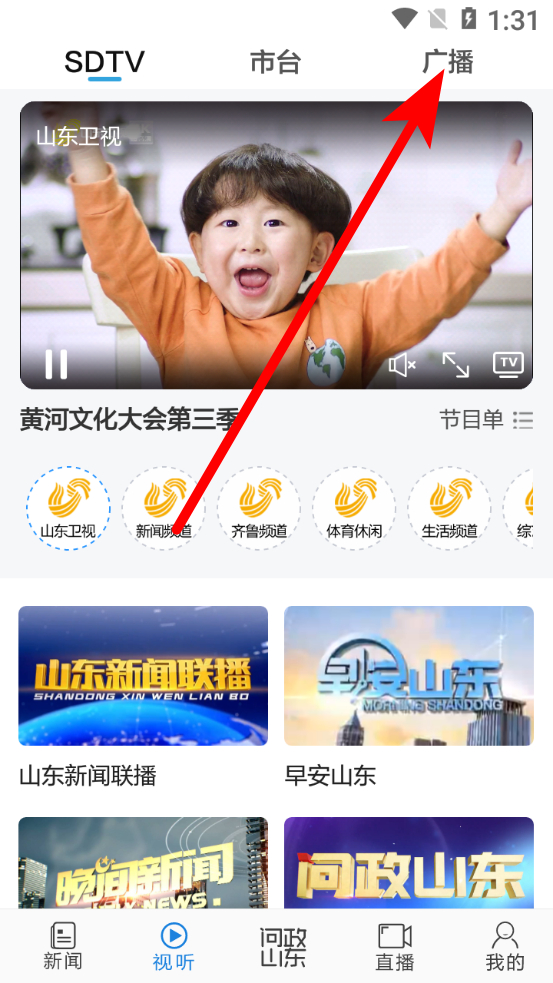2、在视听页面,点击上方广播选项,进入广播频道选择页面。