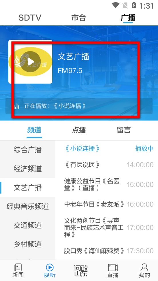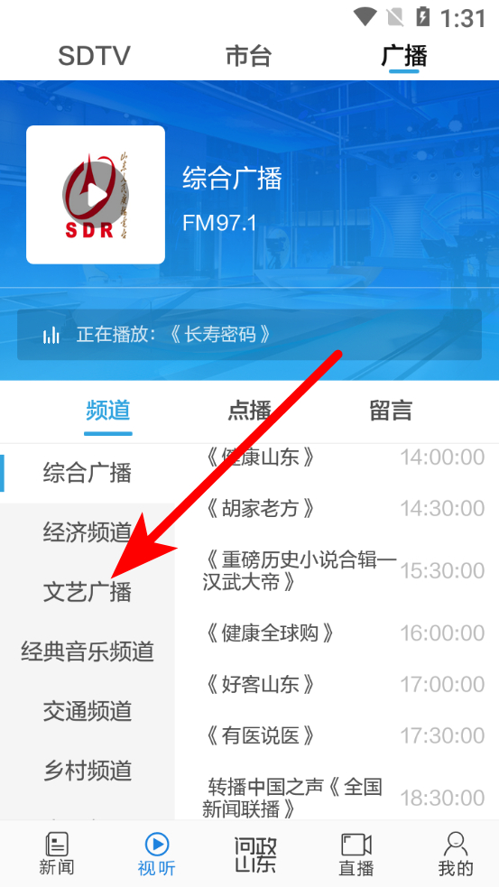 3、在广播频道选择页面,点击想要收听的广播频道,如文艺广播。