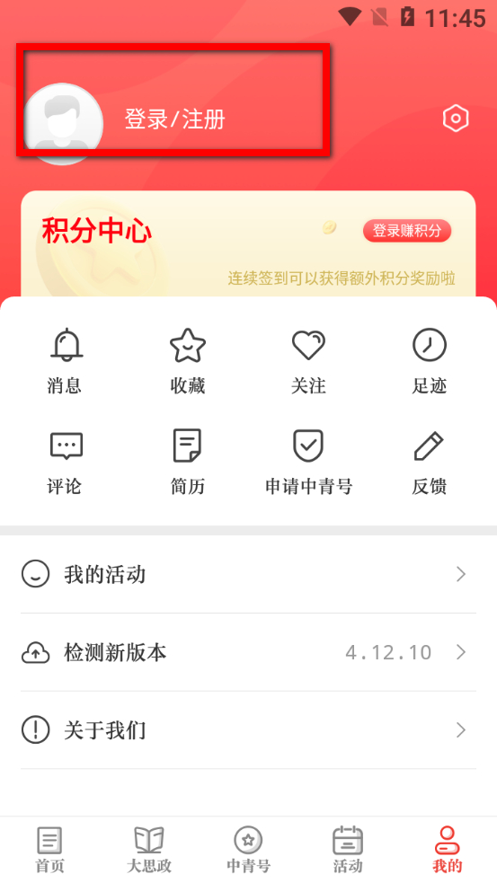 2、在我的页面,点击登录/注册选项,进入登录注册界面。