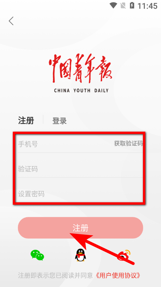 4、在注册页面,输入信息后点击注册按钮,完成中国青年报注册操作。