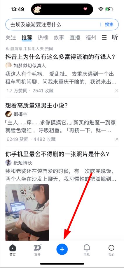1、打开知乎APP,点击底部导航栏中间的+号按钮。